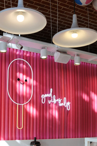 Three hundred and sixty inflatable beach balls cover the arch’s surface, creating a colorful repetitive motif that draws in customers, particularly children. Forty-two pink pool noodles cover the counter backwall and a giant inflatable flamingo stands in the center of the store, enhancing the fun, summer vibe of the ice-cream venue. Additionally, the counter furniture and ice-cream fridges were recycled from a previous shop, while chairs and tables were borrowed from another store for the duration of the three-month pop-up, ensuring continued use afterward. To uphold the zero-waste principle, the design had to preserve the elements’ independence; by assembling them in such a way that they wouldn’t be damaged during disassembly. No glue or nails were used, to enable their re-use after the shop's closure.